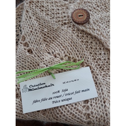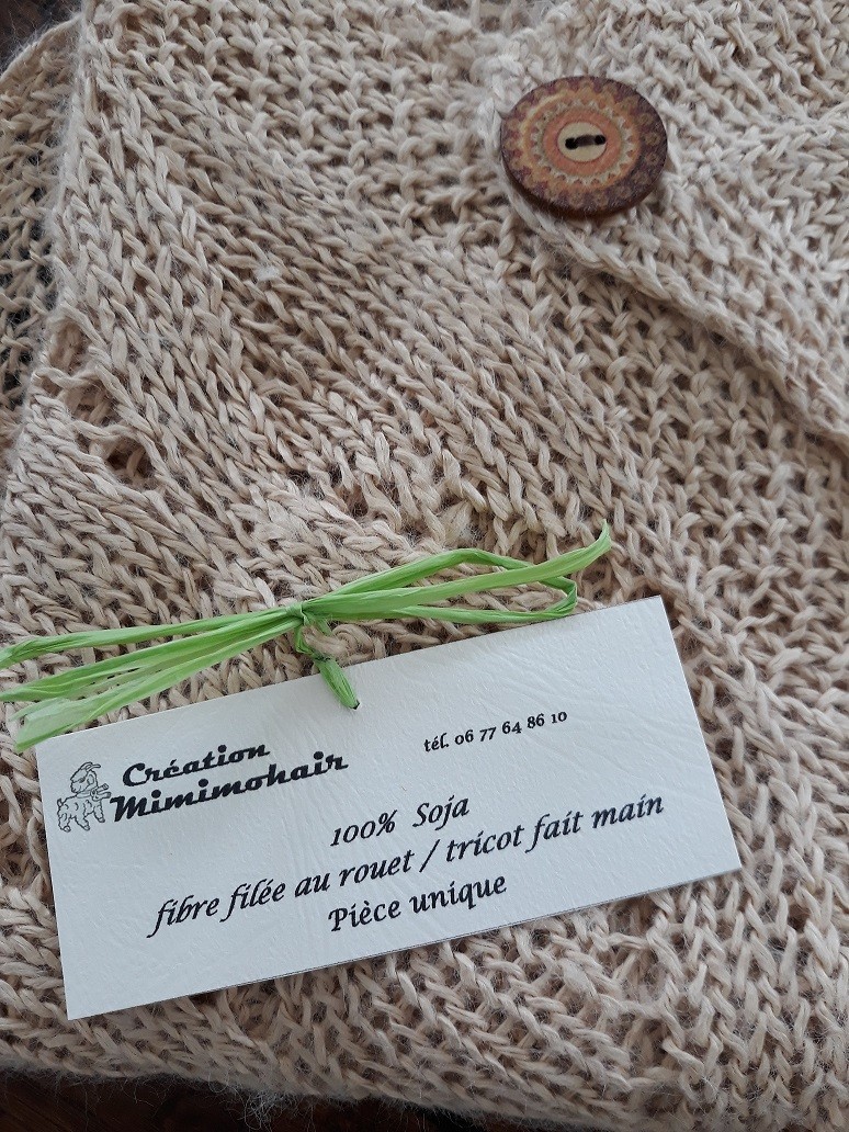 Fibres soja filées au rouet et tricot main entièrement fait avec mes petites mains.