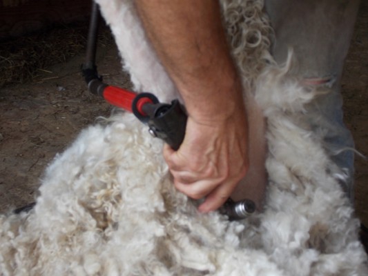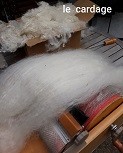 Je travaille le mohair produit par mes 2 chèvres angora. Elles sont tondues 2 fois par an. Ensuite il faut trier, laver, sécher et carder la laine avant le filage.